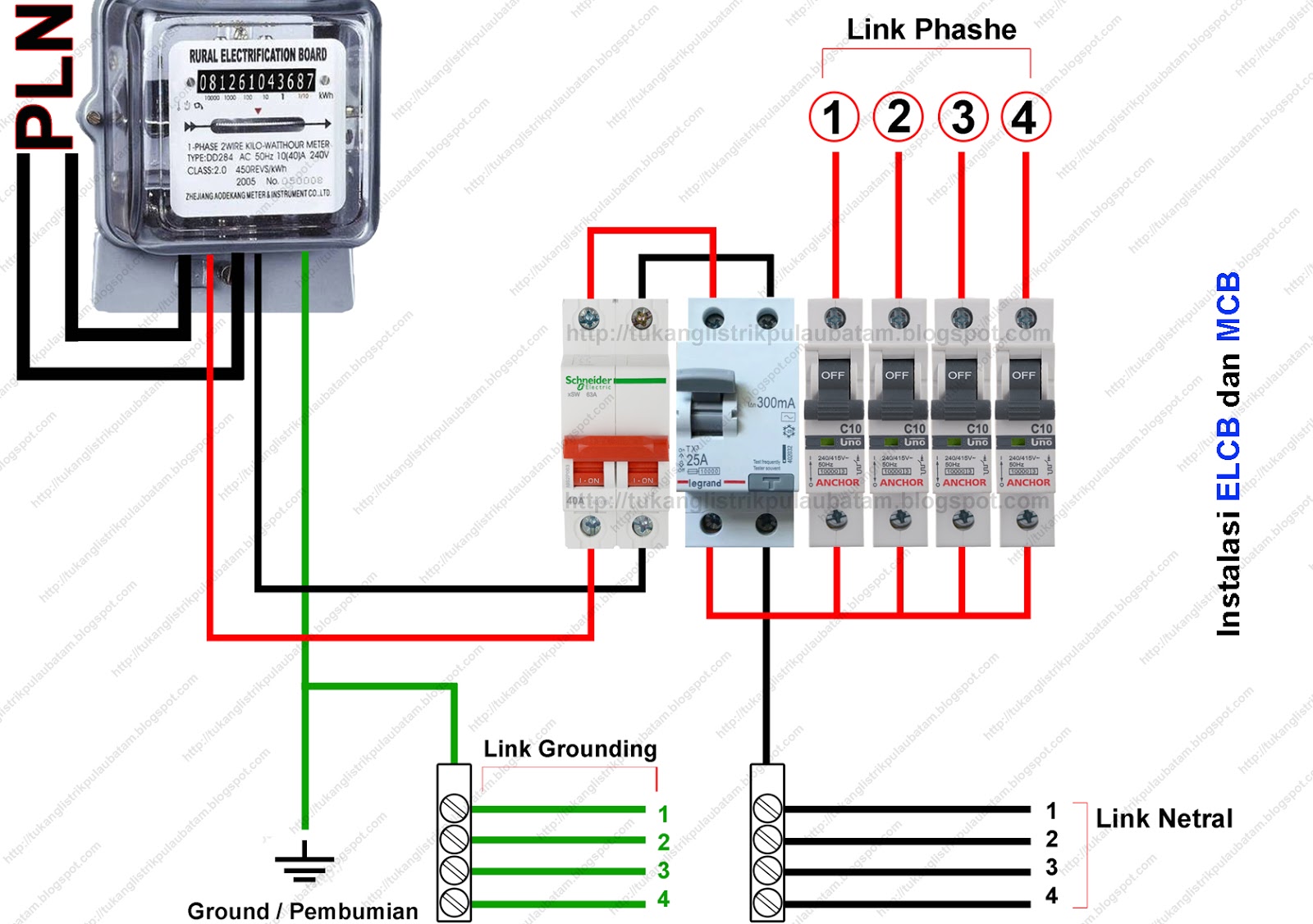 Keterangan Gambar Skema Rangkaian pemasangan ELCB Dan MCB